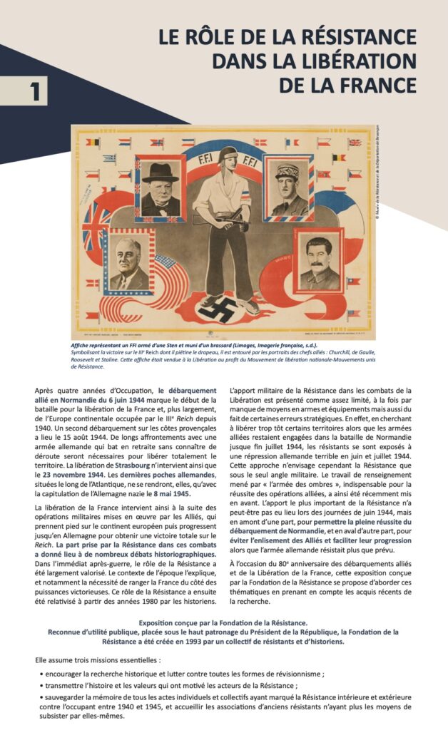 Cette exposition présente le résultat des recherches historiques les plus récentes sur le rôle de la Résistance dans la Libération de la France.
